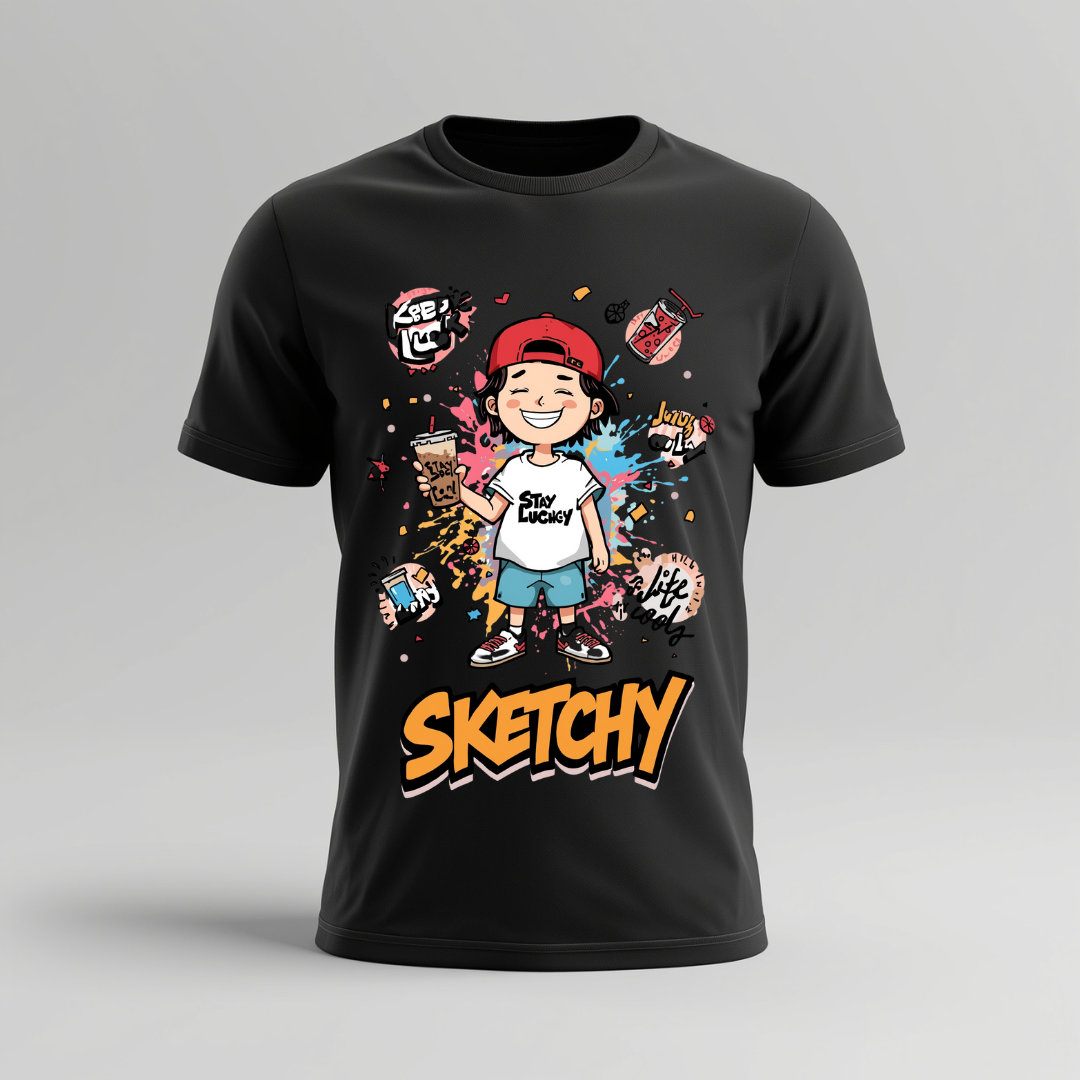 Unleash your inner street artist with our Street Sketchy Graphic T-Shirt – “Stay Lucky” Edition. This black tee showcases a fun and vibrant cartoon character wearing a cap, shorts, and sneakers, surrounded by lively doodles, splashes of bright colors, and motivational phrases like “Stay Lucky” and “Keep Cool”. The large Sketchy typography at the bottom gives it an unmistakable streetwear edge.